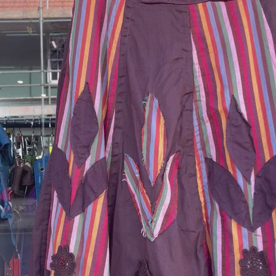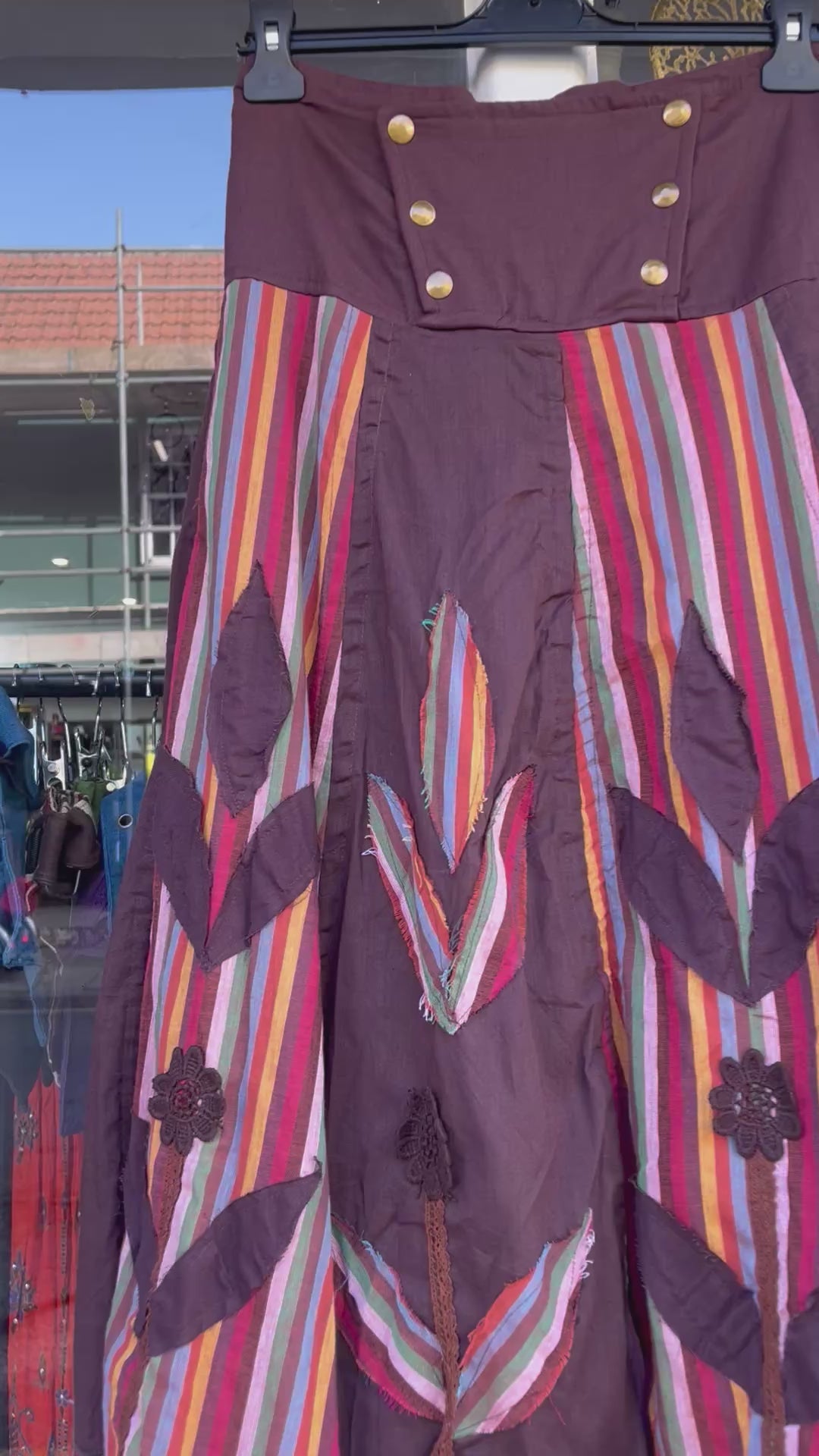 A beautifully detailed, statement skirt full of texture, colour and movement. Created using rich brown cotton with vibrant multicoloured striped panels, this piece blends bohemian charm with flattering structure.