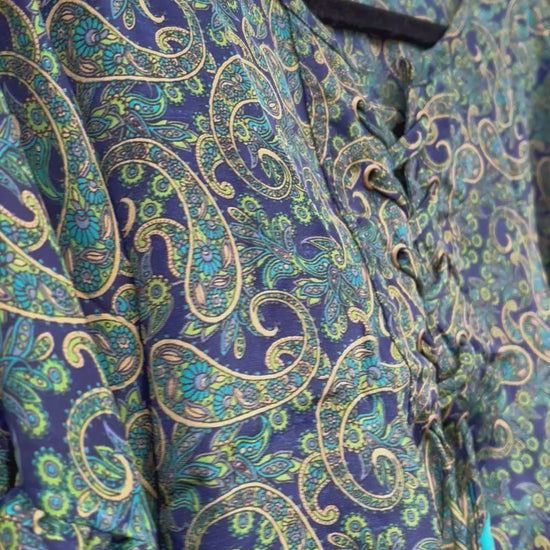 Silky paisley print women’s top with a relaxed, slightly cropped fit. Features a lace-up neckline with tassel ties, long sleeves with gentle gathers and a soft elasticated hem for an easy, flattering shape. Rich tones of teal, blue and green give it a beautiful bohemian feel.