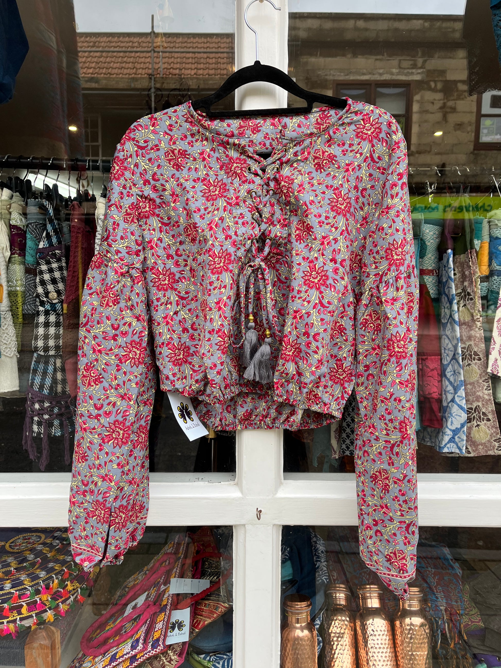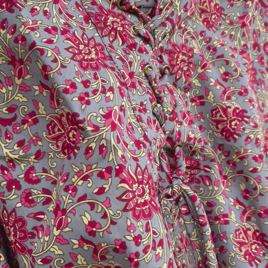Silky floral print women’s top with a relaxed, slightly cropped fit. Features a lace-up neckline with tassel ties, long sleeves with gentle gathers and a soft elasticated hem for an easy, flattering shape. Rich tones of duck egg blue, pink and green give it a beautiful bohemian feel.