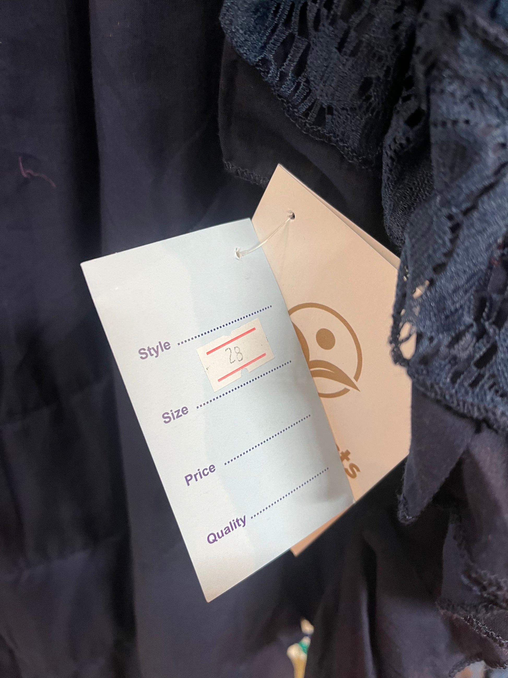 Gorgeous hippie lace skirt in a rich blue tones. Features layered ruffle detailing, raw frayed edges, and lace-up side panels on the hips for adjustability. Super unique, festival-ready piece with a fairycore / hippie / bohemian vibe.