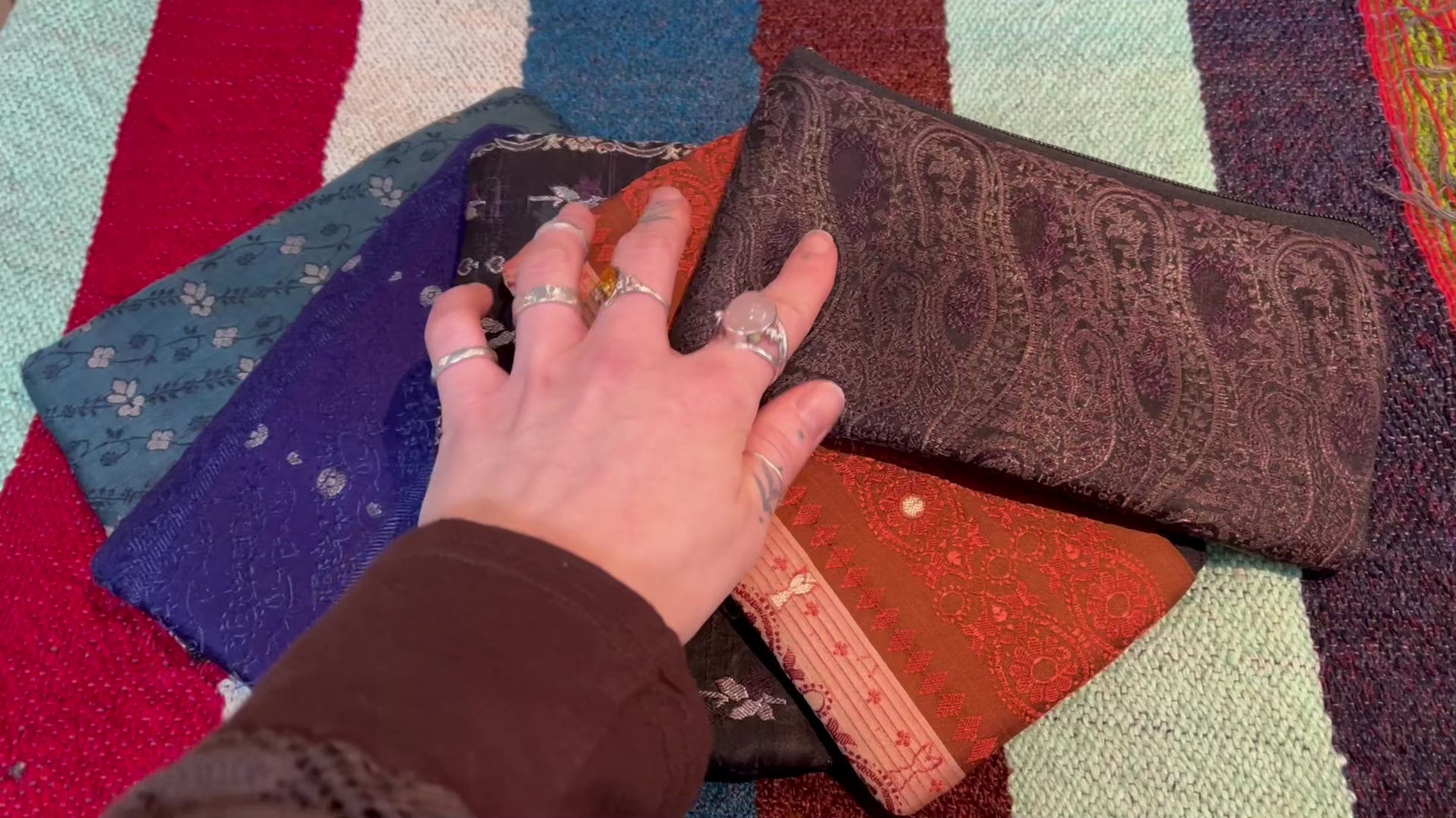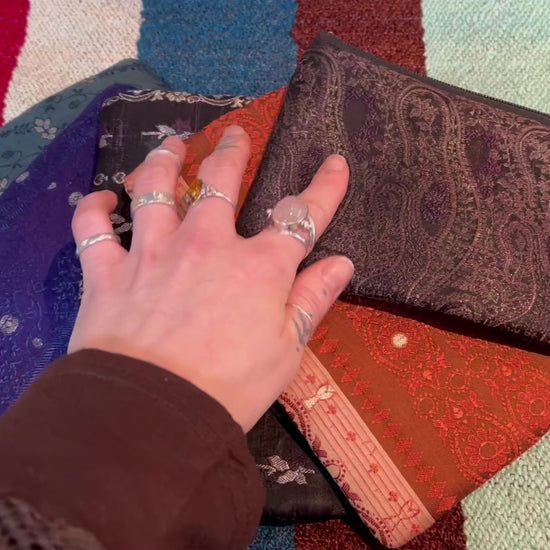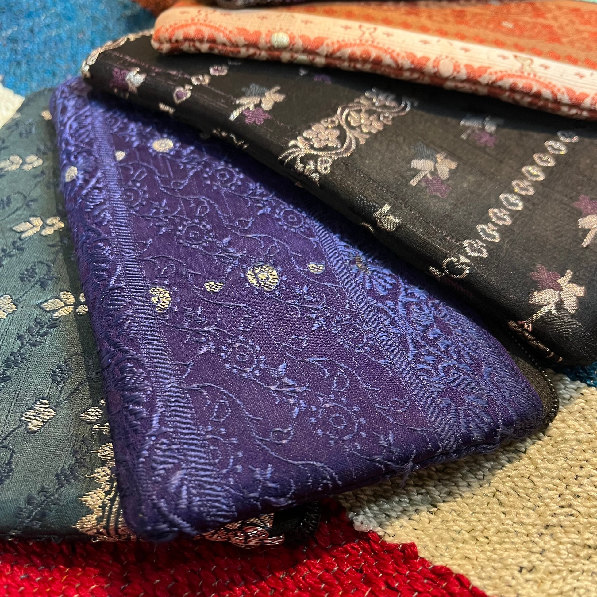 Beautiful Indian fabric purses made from richly patterned, traditional textiles. Each one features unique prints — from intricate paisley and florals to bold geometric and block-print designs — in a mix of deep, earthy and vibrant tones.