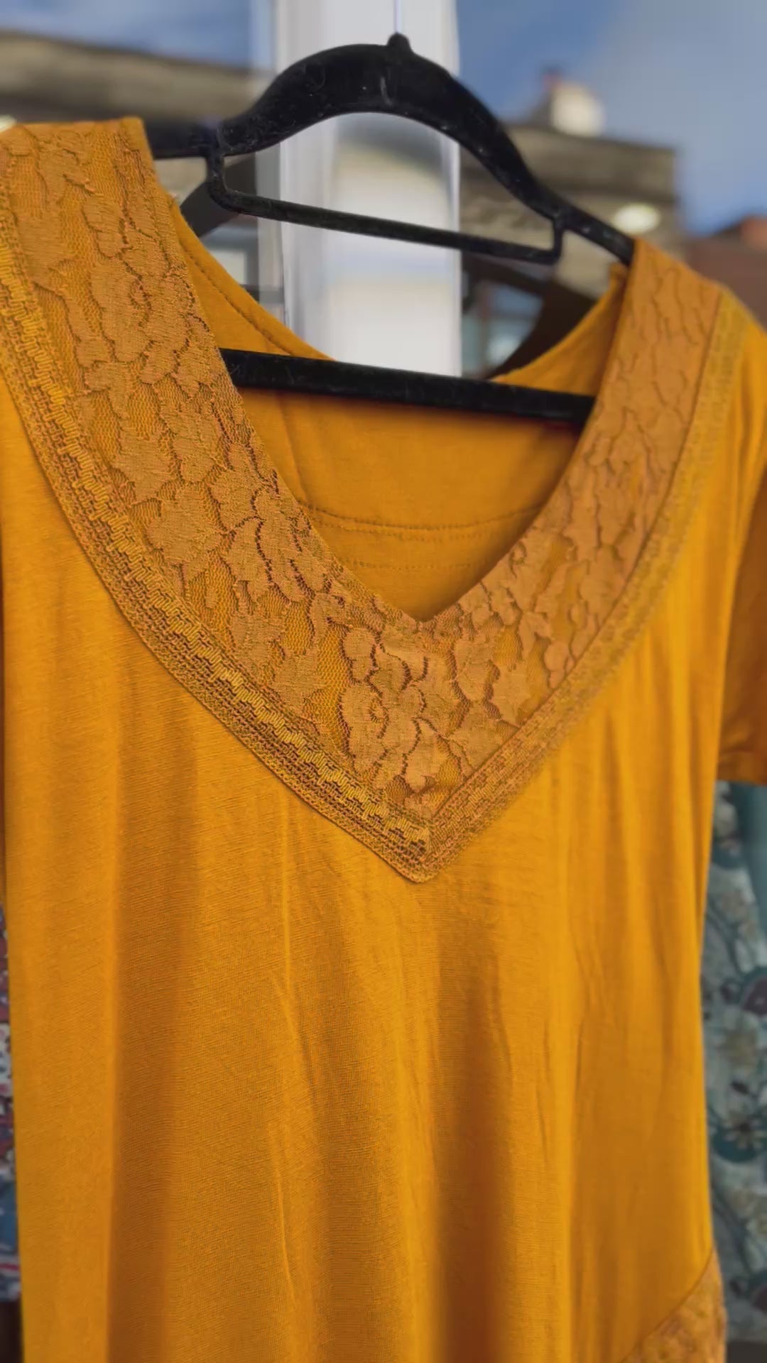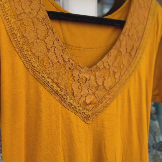 Mustard mini pixie dress with a flattering fitted shape and playful, floaty hem. Features a soft V neckline with lace trim detail, short sleeves and beautiful lace panel inserts that add texture and movement throughout.
