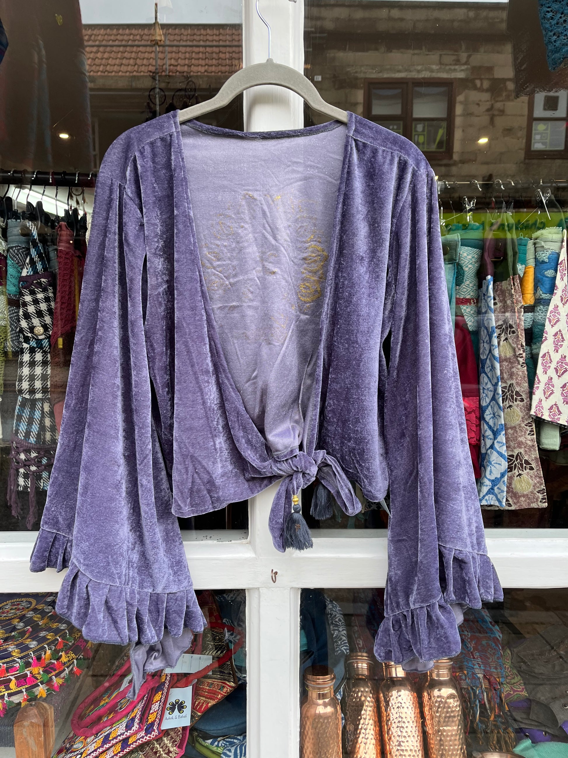 Soft lavender velvet wrap top with a flattering tie-front design and elegant, floaty shape. Features a deep V neckline, long statement sleeves with ruffle cuffs and tassel tie detail for an effortlessly romantic feel. Finished with a beautiful Om motif on the back.