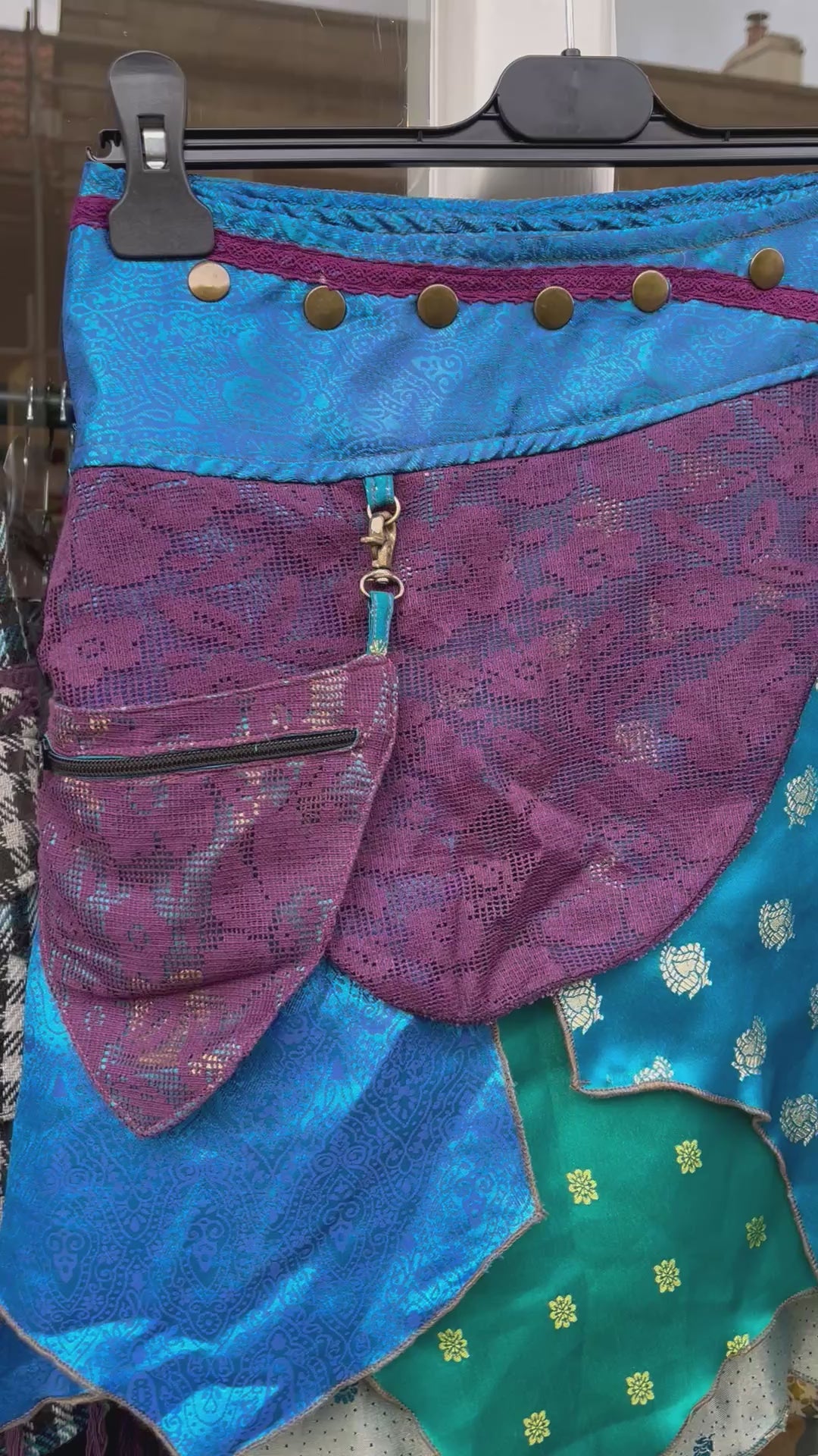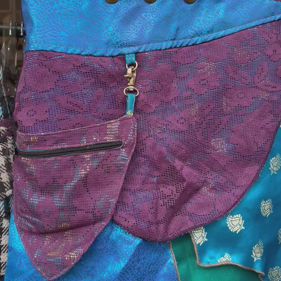 Designed with adjustable brass poppers at the waistband, this skirt comfortably fits UK sizes 6–14, allowing you to tailor the fit to your shape. The asymmetrical, handkerchief-style hem creates movement and flow, while the layered panels in complementary shades of blue and purple add depth and dimension.