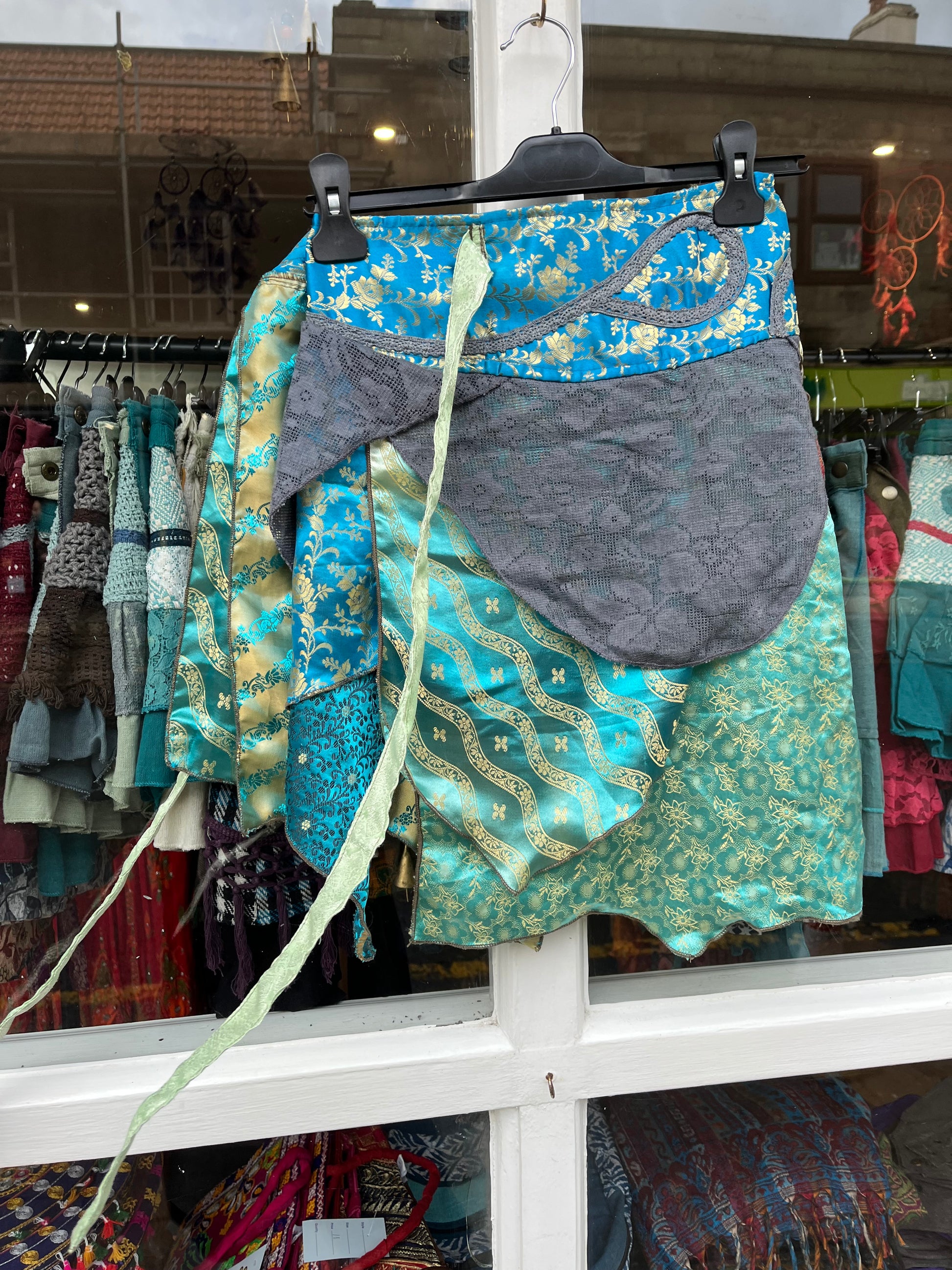 Designed with adjustable brass poppers at the waistband, this skirt comfortably fits UK sizes 6–14, allowing you to tailor the fit to your shape. The asymmetrical, handkerchief-style hem creates movement and flow, while the layered panels in complementary shades of blue and teal add depth and dimension.