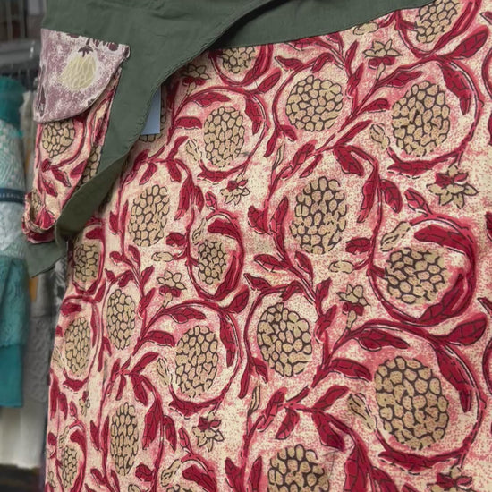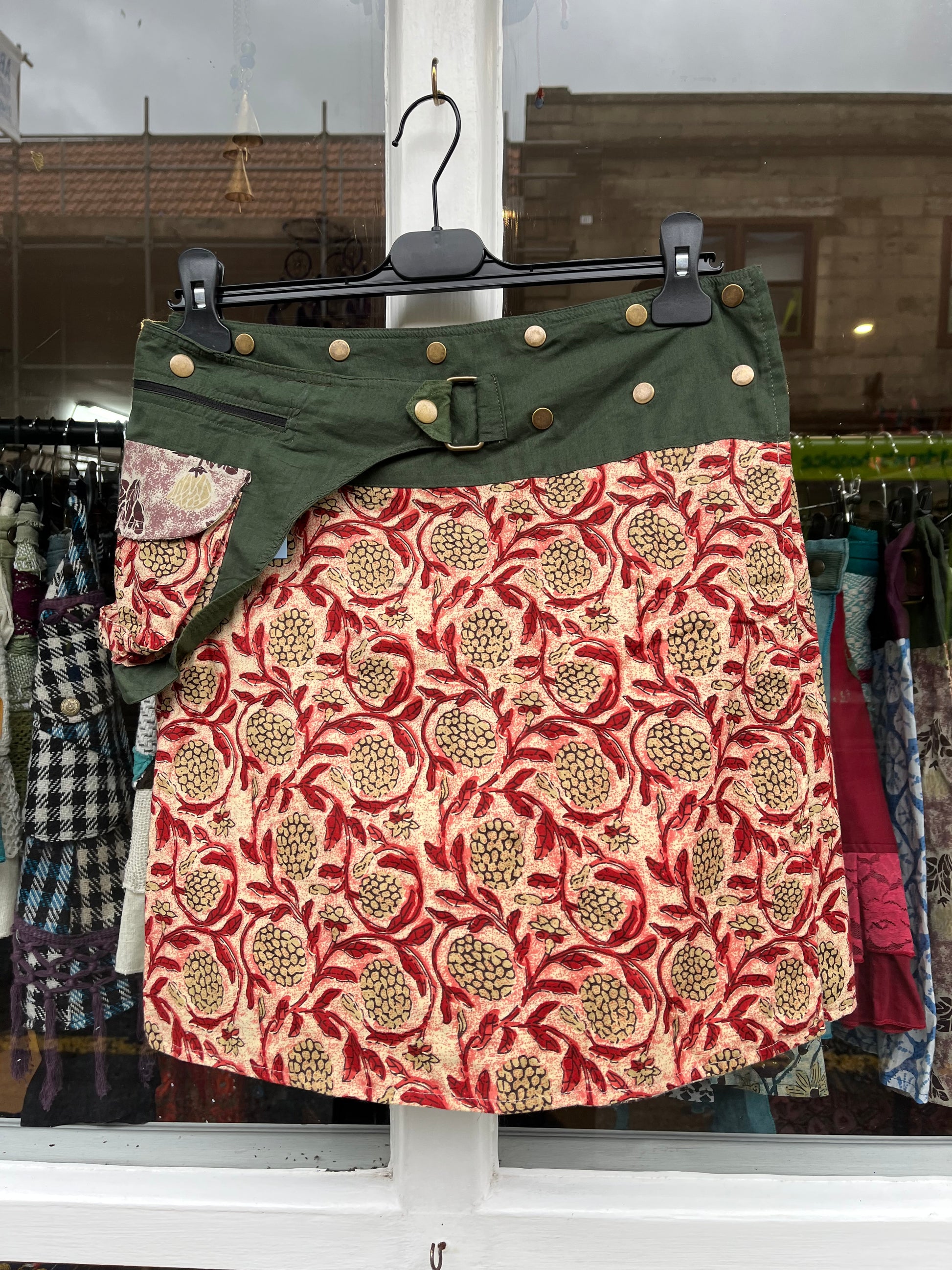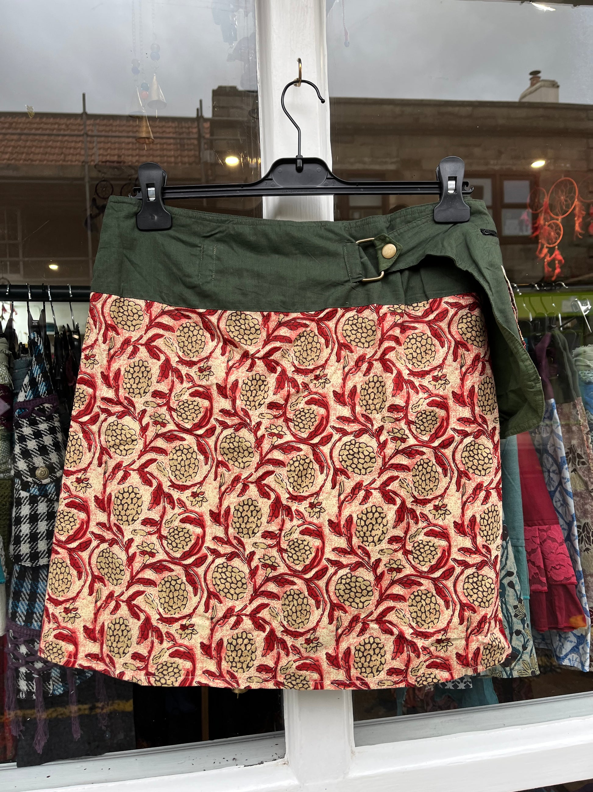 This bold and beautiful mini skirt features a rich, earthy colour palette and striking botanical Indian block print. The body of the skirt showcases a warm cream base with deep red floral pattern, perfectly contrasted by a structured olive green waistband panel.