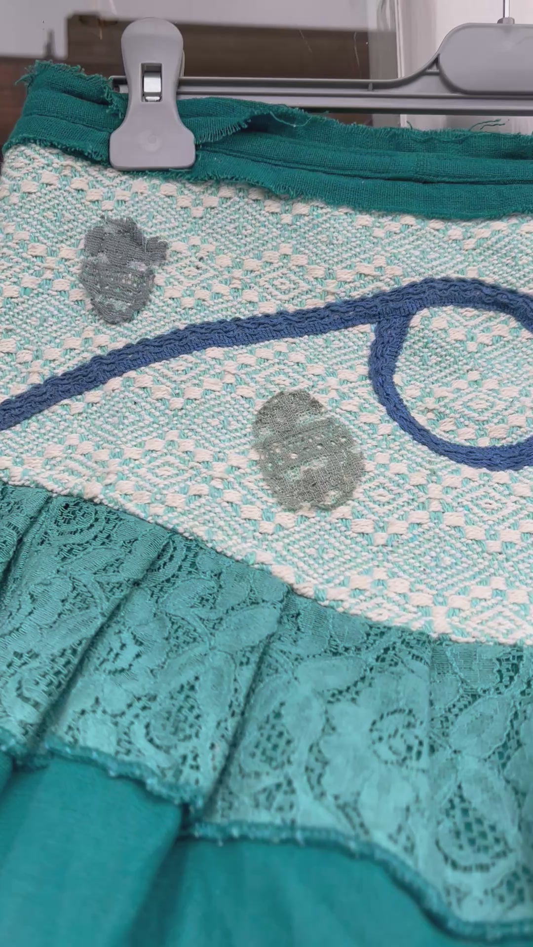 Teal pixie mini skirt with layered lace detailing and unique patchwork panel design. Features a mix of textured fabrics, delicate lace tiers and contrasting appliqué details for a truly one-of-a-kind bohemian look. Designed with adjustable popper fastenings at the waistband, allowing you to customise the fit for comfort and styling. The flattering layered shape gives movement while keeping that playful fairy-inspired vibe ✨