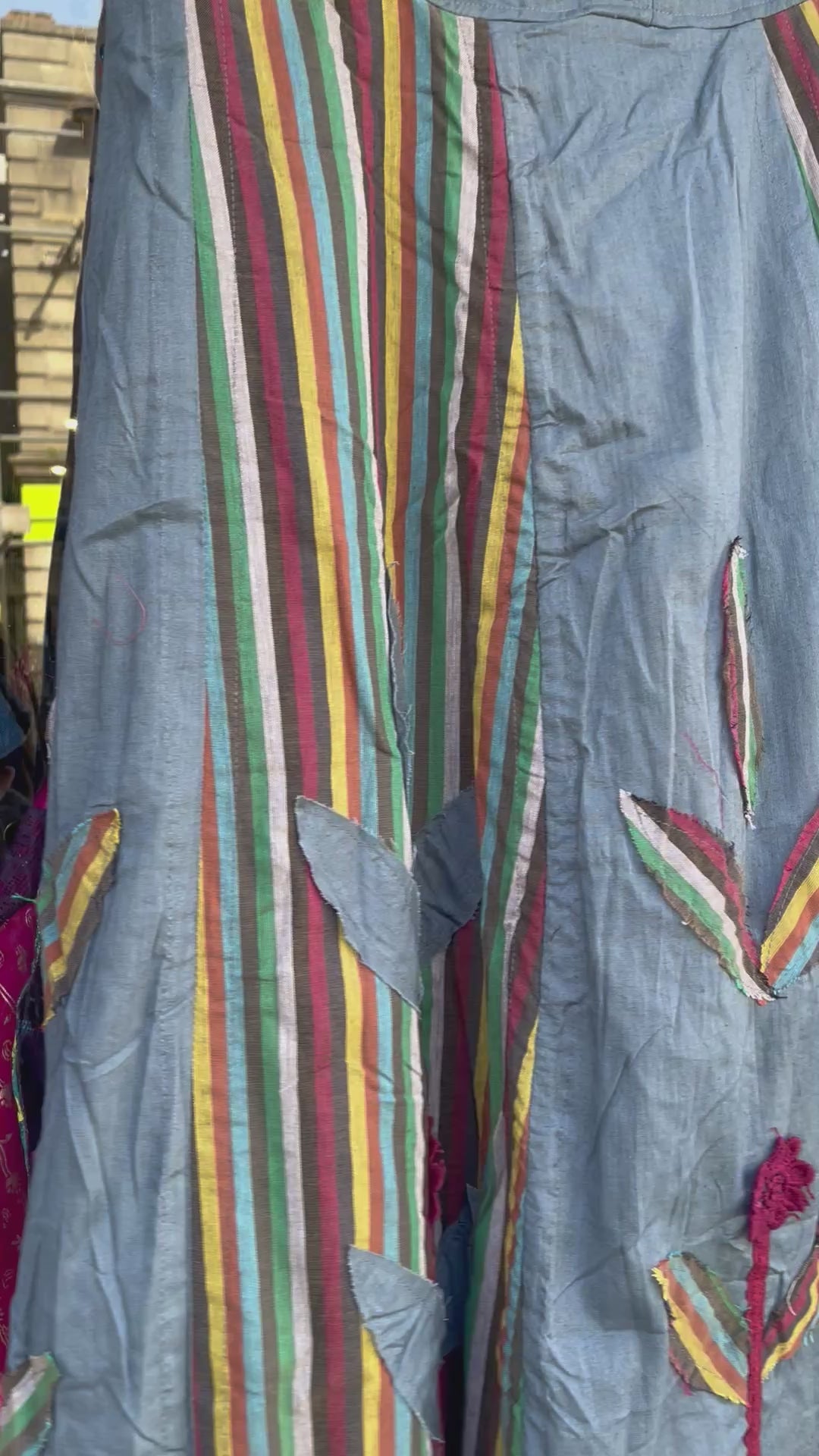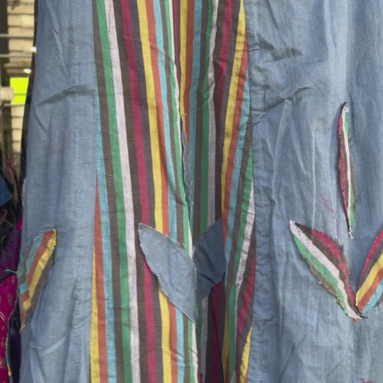 A beautifully detailed, statement skirt full of texture, colour and movement. Created using cool toned slate cotton with vibrant multicoloured striped panels, this piece blends bohemian charm with flattering structure.