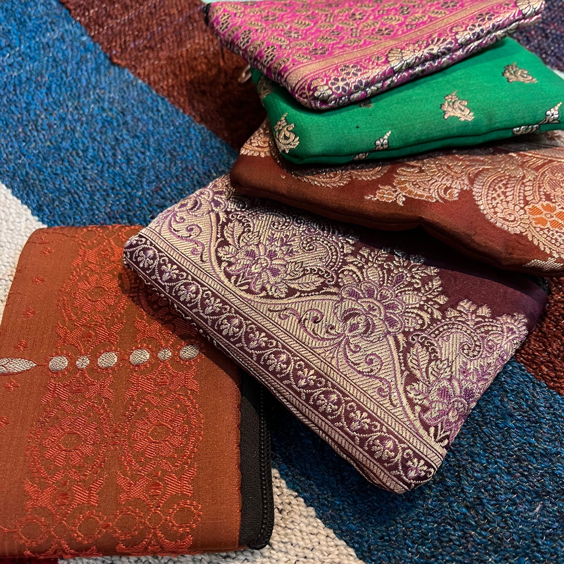 Beautiful Indian fabric purses made from richly patterned, traditional textiles. Each one features unique prints — from intricate paisley and florals to bold geometric and block-print designs — in a mix of deep, earthy and vibrant tones.