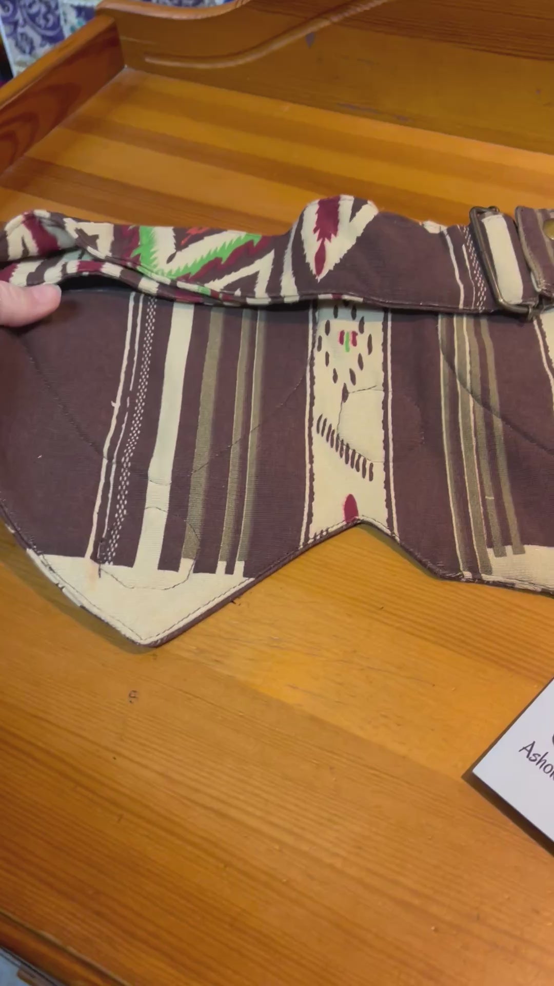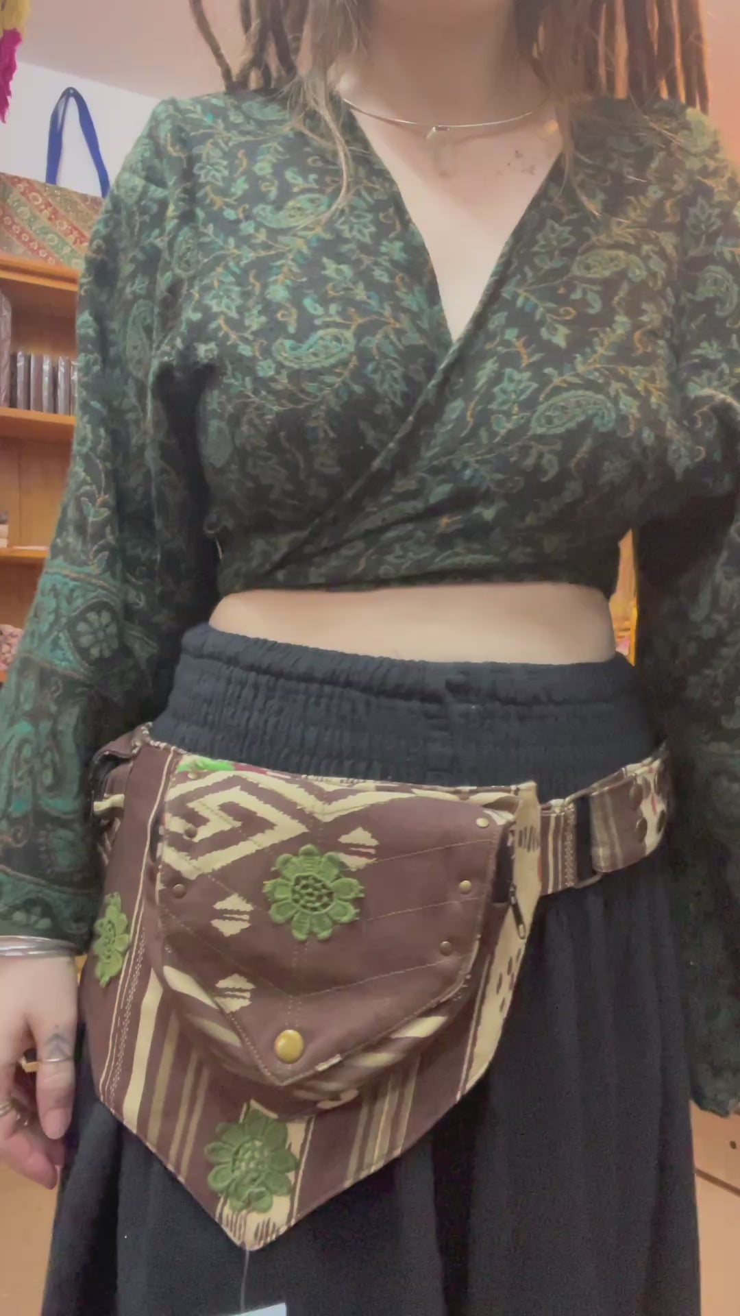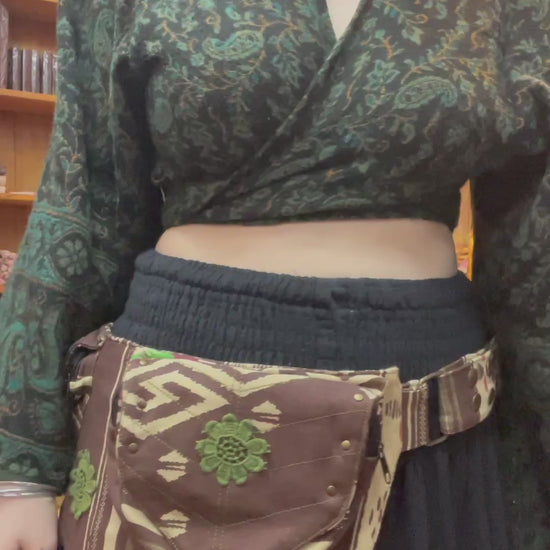 Tribal fairy hip bag in earthy brown and cream tones with beautiful green floral appliqué detailing. Designed with a statement pointed front panel and layered fabric accents for that perfect boho, festival-ready vibe ✨