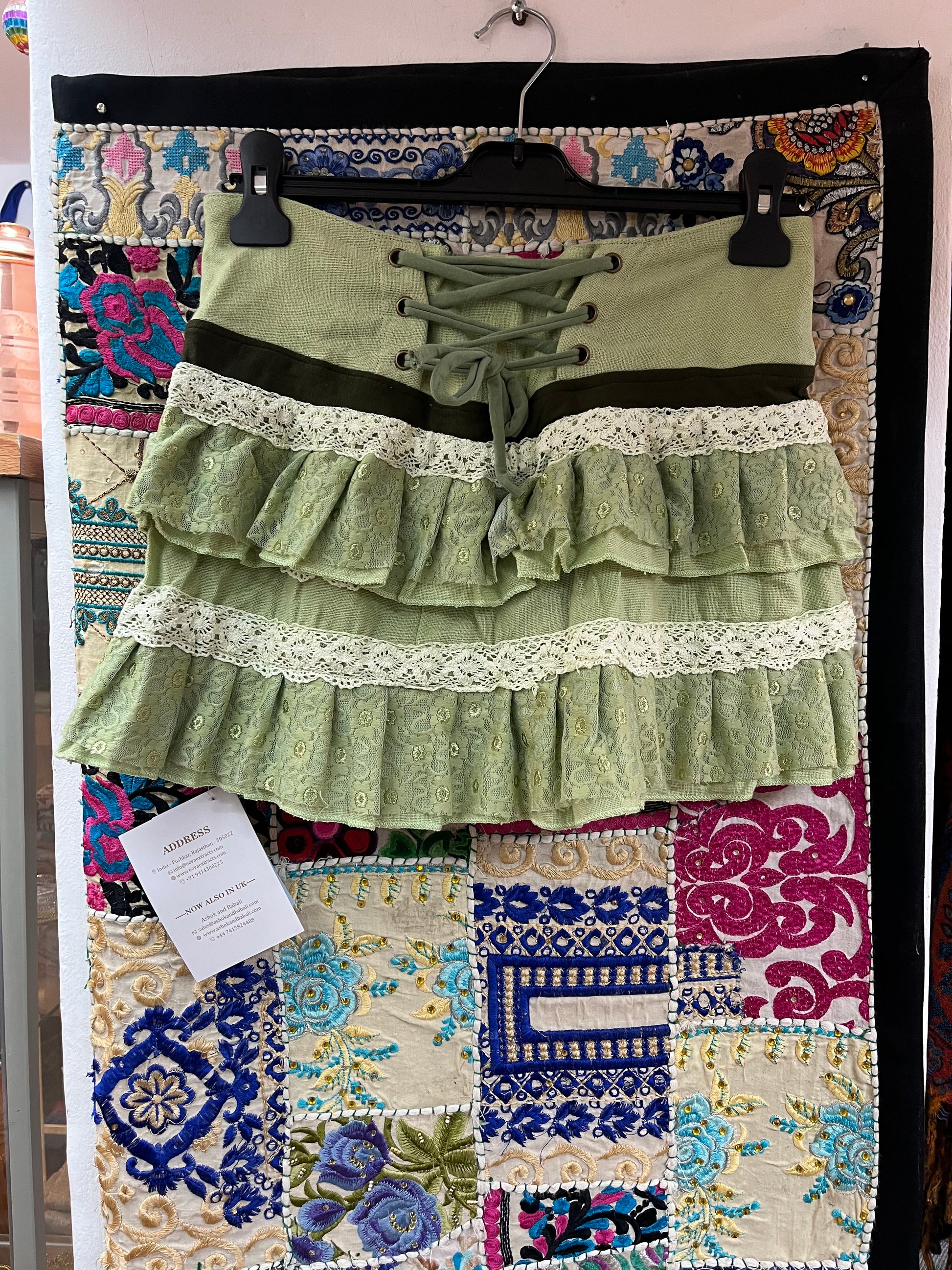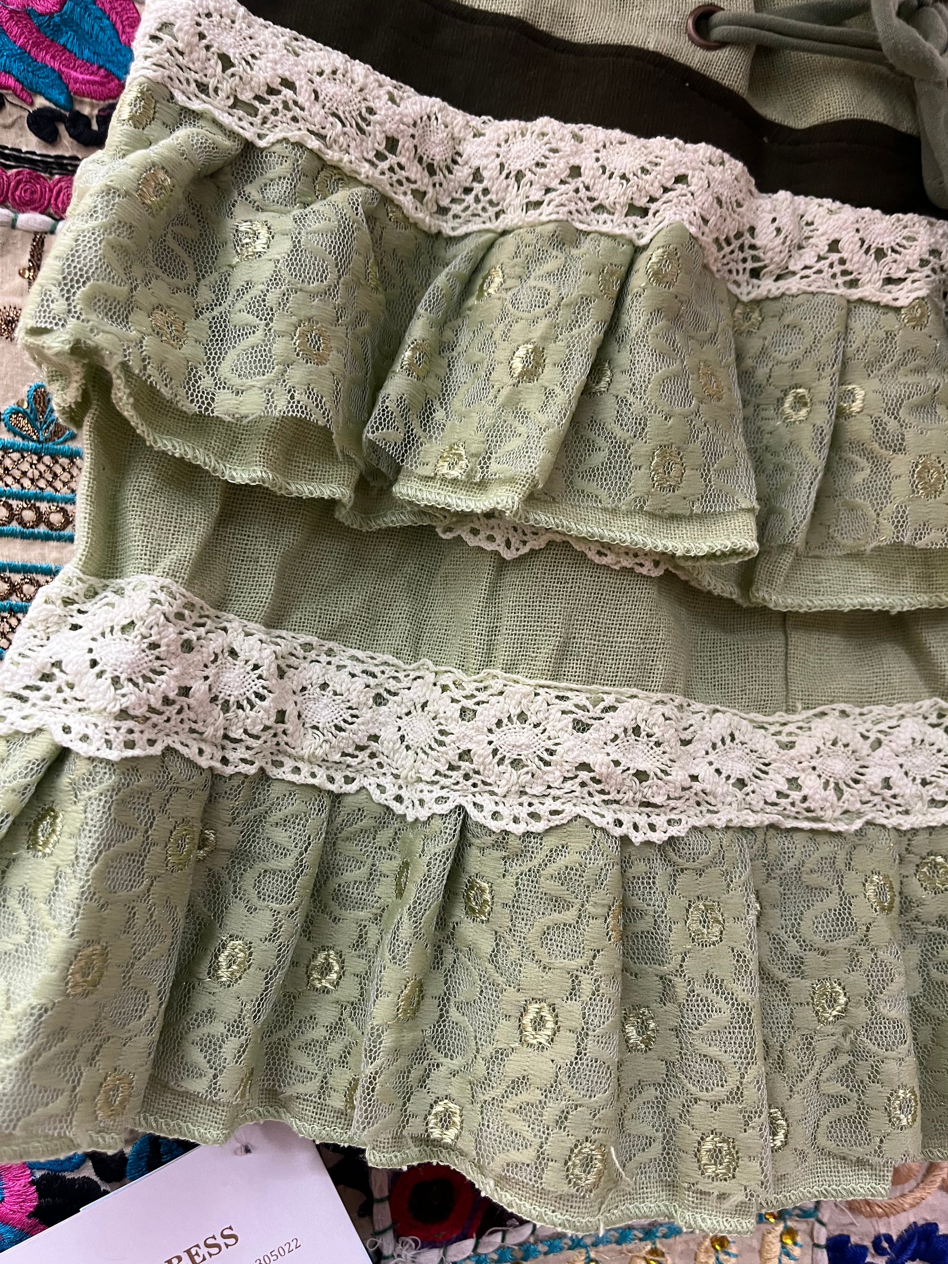 Dreamy fairycore / hippie mini skirt with layered ra-ra ruffles and delicate lace trim. Made from soft cotton in a sage green tone with a lace-up waist detail for an adjustable fit. Super floaty and whimsical, perfect for festival season, summer days, or fairy/boho outfits.